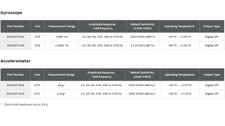 - ±2000 °/s (SCH16T-K10) or ±300 °/s (SCH16T-K01) angular rate measurement range