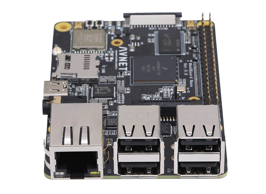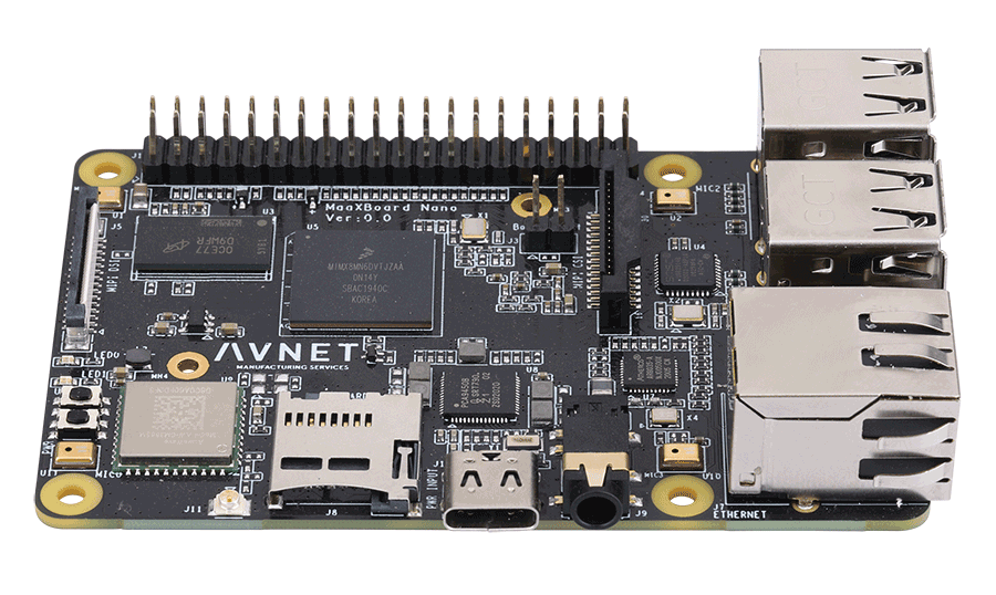 The MaaXBoard Nano contains everything necessary to support and create a Linux, Android or other OS-based systems. The platform offers several on-board peripherals including 1 GB of DDR4 memory, a Gigabit Ethernet port, quad USB 2.0 host ports, MIPI-DSI, MIPI-CSI, WiFi, Bluetooth, MicroSD card slot, four on-board microphones and an audio jack. A Raspberry Pi hat-compatible expansion connector also provides interfaces for UART, SPI, I2C and GPIO. These combined capabilities make it an ideal platform for investigating AI, IOT and multimedia applications.
