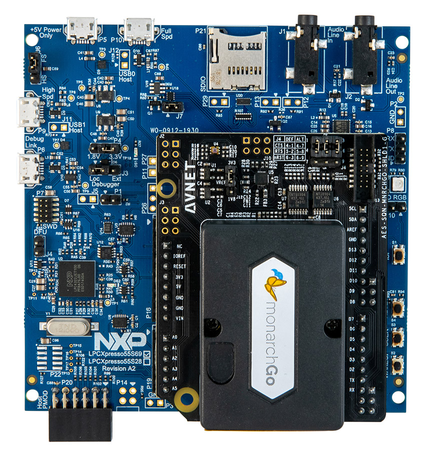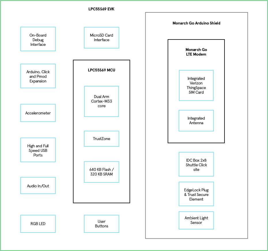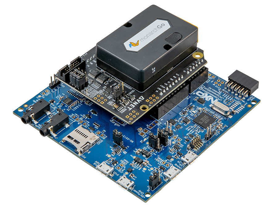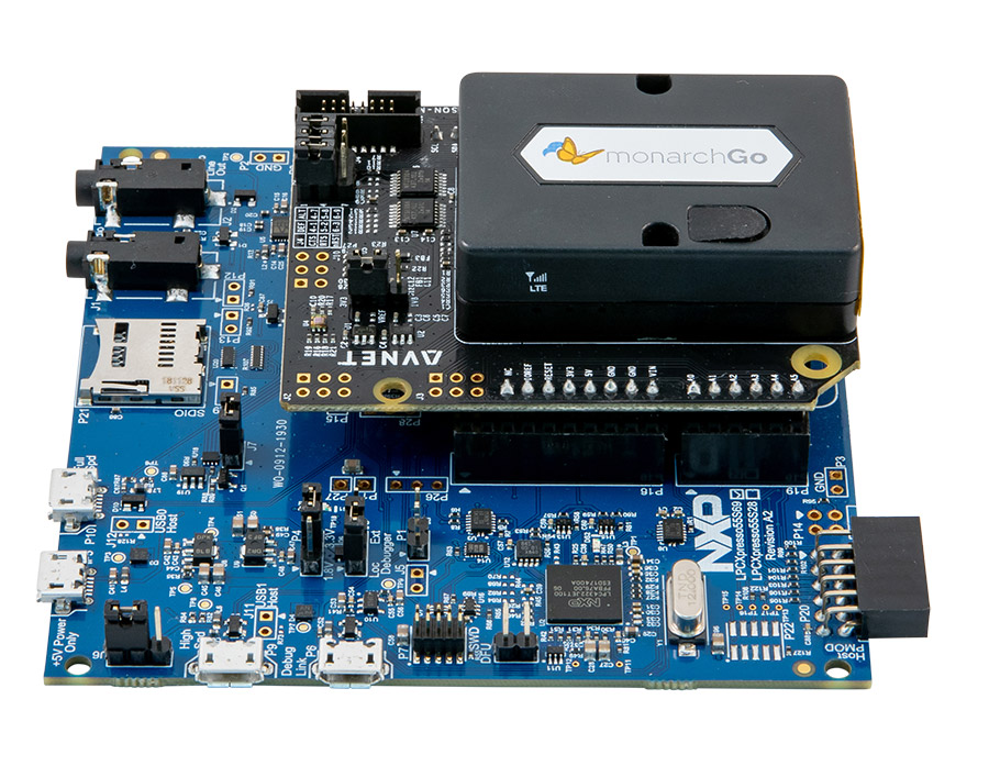 The Monarch LTE-M Development Kit is a cellular IoT enablement platform featuring the NXP LPC55S69-EVK and the Monarch Go Arduino Shield. This kit is an ideal entry point for starting your next LTE IoT application development. The LPC55S69 dual-core Arm Cortex-M33 microcontroller chipset with the production certified Monarch Go modem allows for easy transition from development to production.