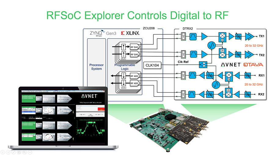 Explore the entire signal chain from millimeter wave RF in the 19 to 31 GHz range to IF sampling in RFSoC Gen-3 data converters reaching 6 GHz. Native connection to MATLAB® and Simulink® is provided by Avnet’s RFSoC Explorer®, featuring graphical control of the platform and intuitive APIs for programmatic access.