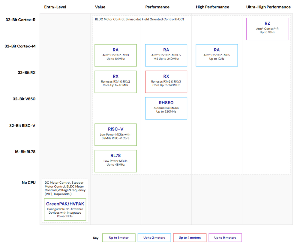 Renesas RA MCU family anchors a broad and scalable motor control portfolio, delivering the performance and real time control needed for BLDC and FOC-based designs across single and multi-motor systems. RA scales from entry-level to high performance devices with software compatibility across the family, while complementary RL78, RISC V, RX, RH850, and RZ platforms extend support from cost-sensitive control to ultra-high-performance motor-driven systems within the Renesas ecosystem.