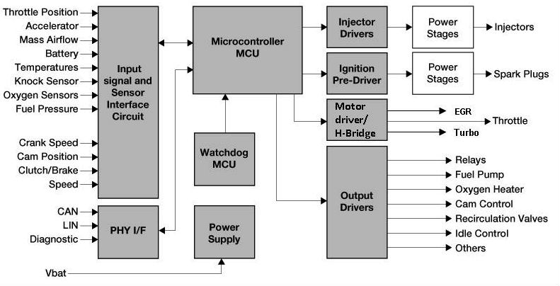 Fig. 2: Engine management systems need to process real-time sensor input and set motors and switches to achieve the desired balance of vehicle performance and efficiency. (Source: NXP Semiconductor)