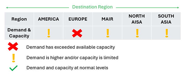• EMEA: Regional performance varies. Europe shows steady growth, helped by transatlantic and Asia routes and increased belly cargo capacity.