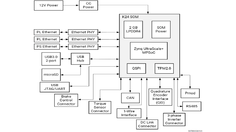 - Interfaces or Connector: x1 PS Gb RGMII Ethernet, x2 PL Gb RGMII Ethernet with time-sensitive networking (TSN), USB3.0, PMOD 12-pin Interface, CAN Connector, Torque Sensor Connector, 3-phase Motor Connector, QEI Connector, RS485 Connector, DC link Connector