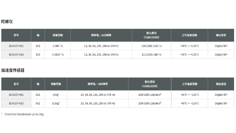 - ±16g(SCH16T-K10)或±8g(SCH16T-K01)的加速度测量范围