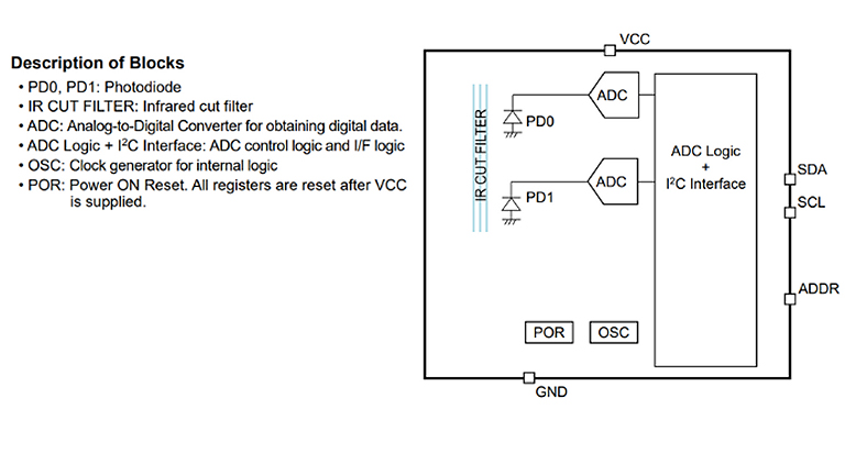 BU27034ANUC is a digital Ambient Light Sensor IC with I²C bus interface. This IC is most suitable for obtaining ambient light data for adjusting LCD and backlight power of TV and mobile phone. It is capable of detecting a very wide range of illuminance.