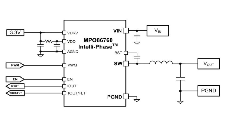 MPQ86760集成的MOSFET和驱动器优化了死区时间 (DT) 并减少了寄生电感,因此具备高效率。