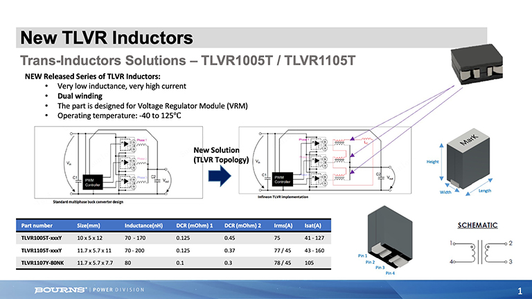 Bourns® TLVR1005T 與 TLVR1105T 系列以創新的跨電感電壓調節器(Trans-Inductor Voltage Regulator, TLVR)架構,專為解決此類挑戰而設計。這一設計採用雙繞組變壓器結構,取代傳統電感,實現相位耦合,有效同步多相供電級,實現超高速瞬態響應。此技術大幅降低負載轉換期間的能量損耗,減少輸出電壓波動,同時削減對過量電容的需求,進一步節省電路板空間並降低系統成本,實現隨處理器需求擴展的高效率功率傳遞,同時維持高功率密度,適用於伺服器、數據中心及邊緣運算設備。