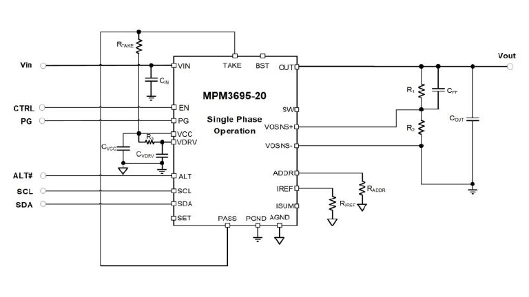 The MPM3695-20 adopts MPS’s proprietary, multi-phase constant-on-time (MCOT) control, which provides ultra-fast transient response and simple loop compensation. The digital interface provides module configurations and monitoring of key parameters.