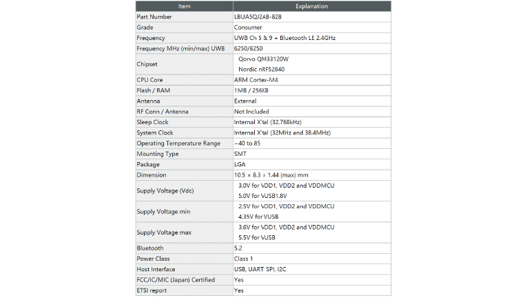 本产品以至今为止在本公司的Wi-Fi和Bluetooth模块产品开发中积累的高频设计技术和特别的高密度贴装技术和树脂封装技术为基础,将在UWB通信和Bluetooth市场分别拥有实绩的Qorvo公司的UWB IC和Nordic公司的Bluetooth Low Energy SoC进行组合,从而开发了小尺寸的UWB通信模块。