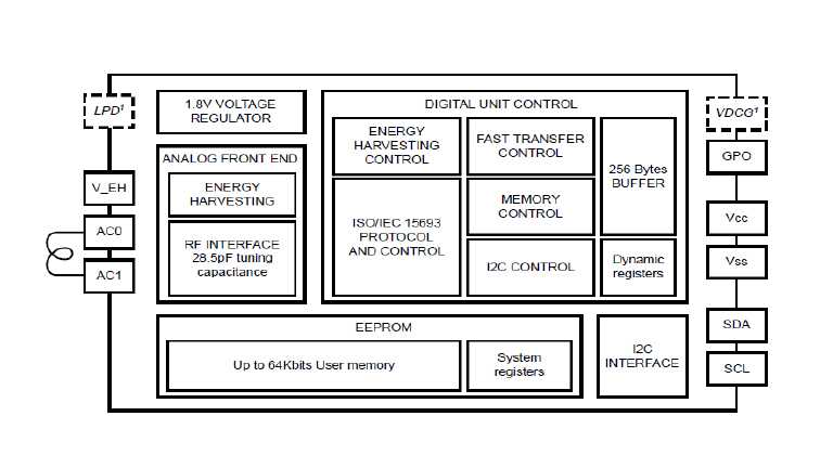 These devices offer a fast transfer mode between the RF and contact interfaces, thanks to a 256 bytes volatile buffer (also called mailbox). In addition, the GPO pin provides data about incoming events, like RF field detection, RF activity in progress, or mailbox message availability. An energy harvesting feature is also available.