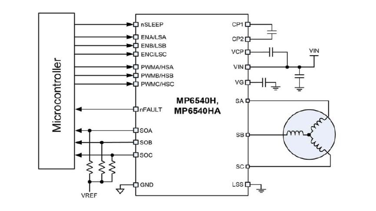 The MP6540H and MP6540HA are three-phase brushless DC motor drivers. These devices integrate three half-bridges consisting of six Nchannel power MOSFETs, pre-drivers, gate drive power supplies, and current-sense amplifiers.