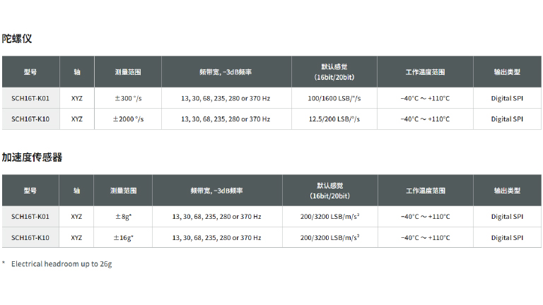 - ±16g(SCH16T-K10)或±8g(SCH16T-K01)的加速度测量范围