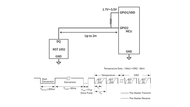 NST1002是一款高精度雙引腳單總線型溫度傳感器。NST1002具有單總線協議輸出接口以及在寬溫度範圍內高精度的特性可直接與 MCU連接使用, 保障測量精度的同時降低開銷。NST1002器件在-50℃至150℃的溫度範圍內支持±0.5℃的最大精度,同時具有極高的分辨率(0.0078125℃),無需借助系統校準或軟硬件補償。單總線協議的數字接口設計用於直接連接GPIO,從而簡化硬件實施。簡單的雙引腳架構使得NST1002器件可輕松轉換成雙線溫度探針。