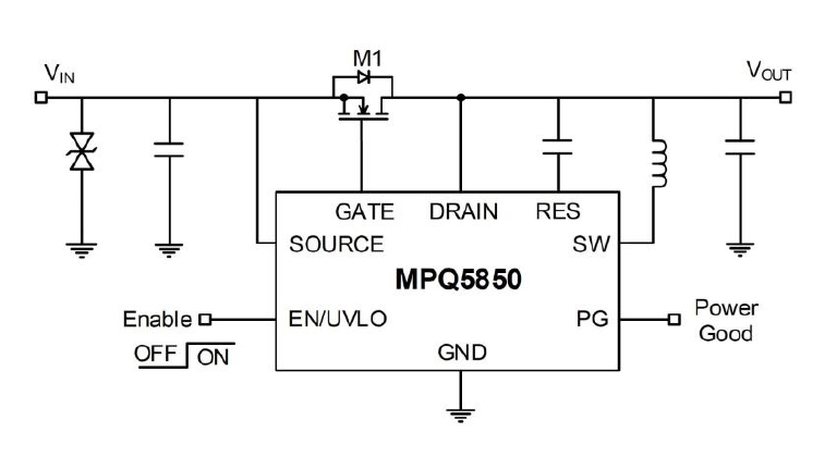 The MPQ5850 integrates an internal boost to provide a boost voltage that turns on the external N-channel MOSFET, even at a low VIN. An open-drain, power good (PG) signal indicates when the external N-channel MOSFET is fully on.