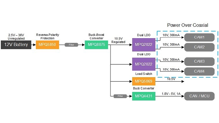 The MPQ5850 is a smart diode controller that can drive an external N-channel MOSFET to replace a Schottky diode for reverse input protection. The device’s 20mV ultra-low dropout minimizes power loss and enables a low minimum input voltage (VIN), which makes the MPQ5850 well-suited for cold-crank conditions in automotive applications.