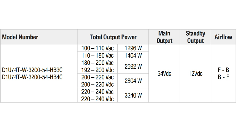 D1U74T-W-3200-54-HBxC系列为紧凑型3200W高效前端电源模块,具备54Vdc主输出与12Vdc辅助输出。