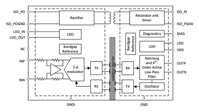 NSI3600D是一款集成隔离电源的高性能隔离放大器,支持±250mV差分输入范围。芯片集成了隔离的DCDC电源,可以在低压侧单电源供电下工作,省去高压侧供电电路,简化设计及板级面积。NSI3600D的固定增益是8.2,全差分输出,支持极低的偏置电压和增益误差及温漂,保证芯片可以在全温度范围内支持极高的采样精度。同时芯片还支持极高的共模瞬态抗扰能力,保证在电源和工业电机驱动等具有高频开关扰动的系统中能够可靠稳定工作。芯片还集成了内置隔离电源监测及自诊断输出引脚,进一步简化系统设计,增强可靠性。