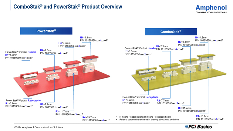 ComboStak® 与 PowerStak® 为紧凑型板对板连接器,支持混合(信号+电源)及电源连接应用。