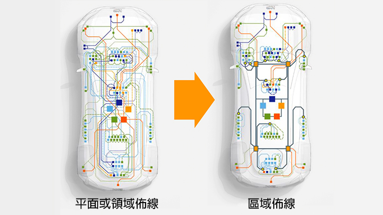 領域佈線方法使用高成本、冗長且笨重的線束,區域系統則使用備援乙太網路骨幹來服務每個區域,同時連接所有主要車輛功能。