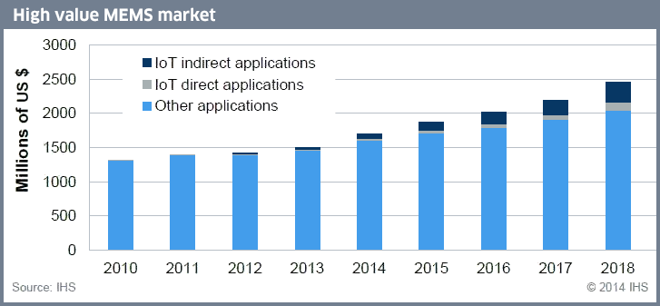 The direct and indirect market for high-value MEMS devices related IoT applications is expected to grow dramatically to 2018, according to market research firm IHS. (Source: IHS)