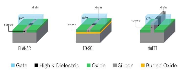目前正在生产的三种半导体工艺技术,包括用于平面体CMOS硅、用于低噪声和快速操作的全空乏绝缘上覆硅(FD-SOI) 以及用于高性能的鳍式场效晶体管(FinFET)