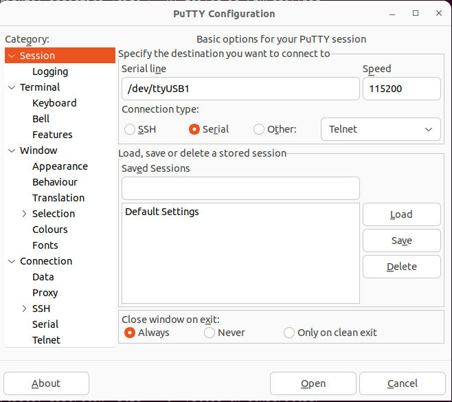 (Selial line の番号は人によっては異なる場合があるが、ttyUSB0~ttyUSB3のいずれかになる)