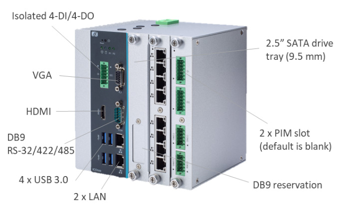 - 2 PIM (plug-in I/O module) slots (isolated CAN/COM, DIO, LAN, PoE)