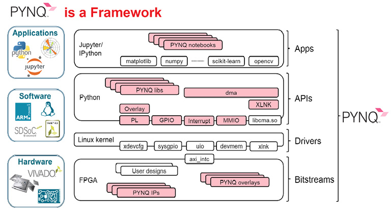 PYNQは、ザイリンクスのオープンソースプロジェクトです。ザイリンクスのZynq-7000 AP SoCデバイスやUltrasScale+ MPSoCデバイスを利用した組込みシステム設計を容易にします。ソフトウエア設計者は、Pythonの言語とライブラリを使用して、Zynq-7000 AP SoCのプログラマブルロジックとマイクロプロセッサの利点を利用して、以下の様な多くの組込みシステムを構築できます。