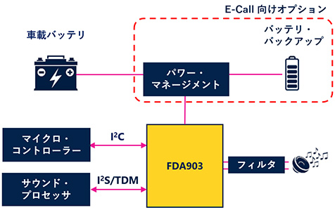 FDA903は自己診断機能内蔵、高効率デジタル信号入力車載用1チャネル・フルデジタル・パワー・アンプで、緊急時システム電源を含めた低電源電圧・Start & Stopに対応します。また、小型パッケージで省スペース化に貢献します。