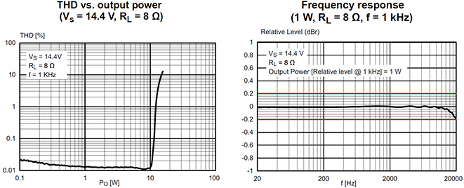 - 参考出力値: 1x20W@14.4V, 4Ω, THD 1%