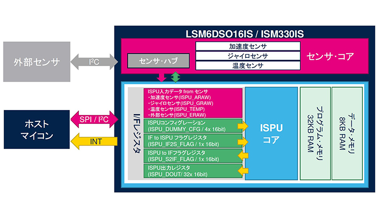 STのプロセッサとして新しいカテゴリとなるISPU(インテリジェント・センサ処理ユニット)が組み込まれており、センサ・データに依存するリアルタイム・アプリケーションをサポートします。ISPUは、超低電力、高性能、かつプログラマブルなコアで、信号処理やAIアルゴリズムをエッジ内で実行できます。ISPUの主なメリットは、自由度の高いC言語でのプログラミングや、用意されたいくつかのライブラリとサード・パーティのツール / IDEを使用した高度な開発エコシステムです。