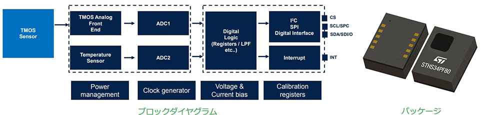 STHS34PF80は、レンズを使用せずに70cm² x 25cm²の物体に関し最大4mまでの近接検出やプレゼンス検知を行うことができる、工場出荷時に校正済みの非冷却式赤外線センサです。動いている対象物を検出できるだけでなく、赤外線量に応じたDC出力が可能であるため、対象物が静止していてもセンサの前に存在していることを検知できます。また、Fresnelレンズを簡単に適用して検出距離を伸ばしたり視野を広げたりすることが可能です。