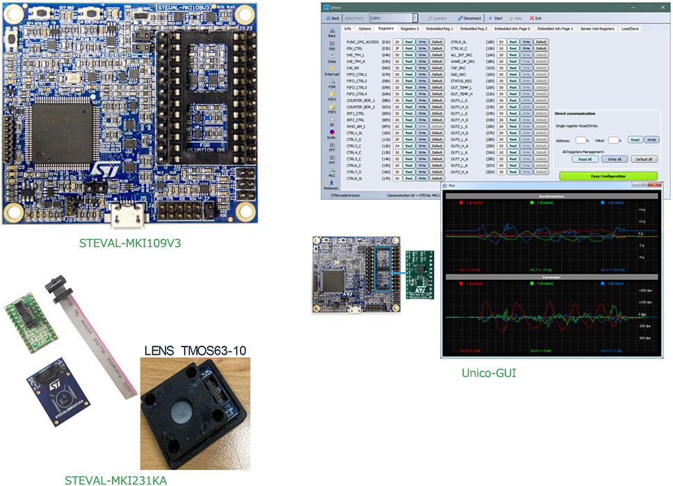 MEMSマザーボードSTEVAL-MKI109V3/STHS34PF80アダプタ STEVAL-MKI231KAとMEMSセンサ評価キットソフトウェアパッケージ。Unico-GUIの組み合わせにより、センサ動作の確認・評価が可能となります。