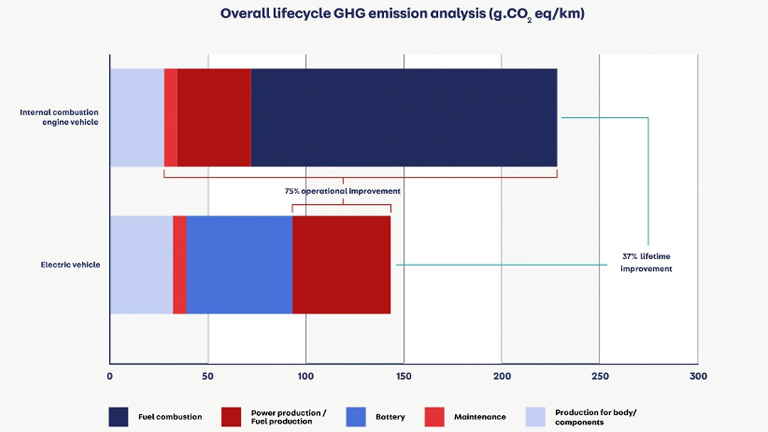 ガソリン車やディーゼル車からEVに乗り換えることで、温室効果ガス(GHG)排出量を約37%、事業活動における排出量を約75%削減できるという調査結果も出ています。下の図表からわかるように、内燃機関自動車と比較すると、EVは車体とバッテリー生産を除くすべての分野において炭素排出量が少なくなっています。