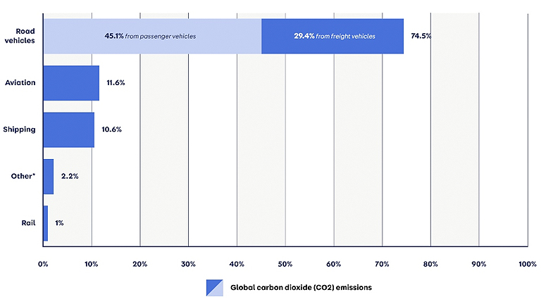 下の図表からわかるように、運輸業は地球の温室効果ガス排出の主要な原因となっています。 特に、道路輸送は世界の二酸化炭素 (CO2)排出量のほぼ半分を占めています。