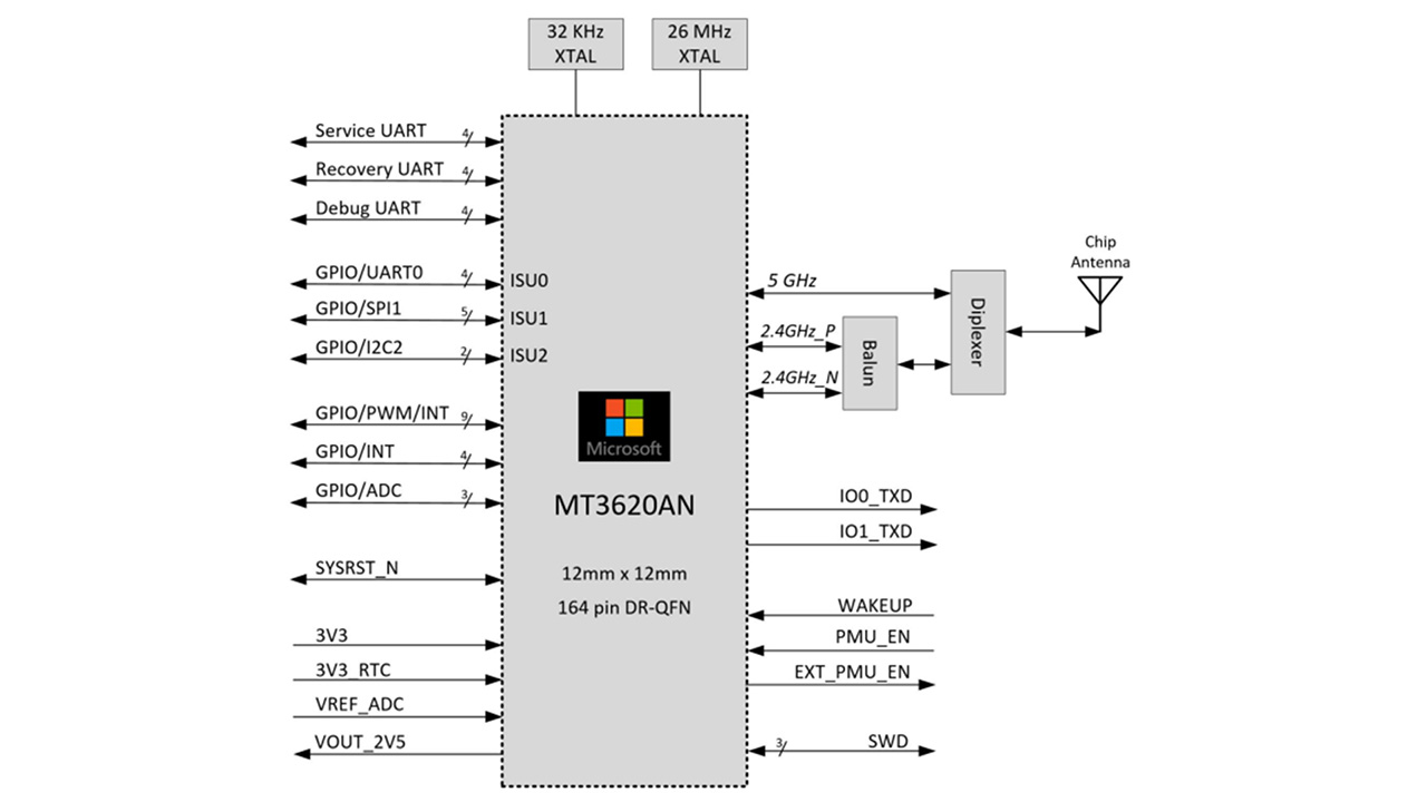 IO | 3 x ISU serial interface, pre-configured for I2C, SPI, UART 1 x I2S support slave and TDM slave mode 3 x 12bit ADC input I/O (or GPIOs) 9 x PWM outputs (or up to 24 GPIOs) 1 x RTC (requires VBAT supply) Programming & Recovery interface |