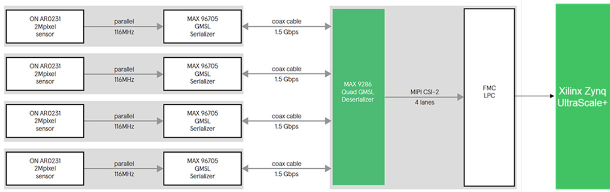 The Avnet Multi-Camera FMC module supports up to four (4) high definition camera modules using MAXIM Integrated’s GMSL (Gigabit Multimedia Serial Link) technology.