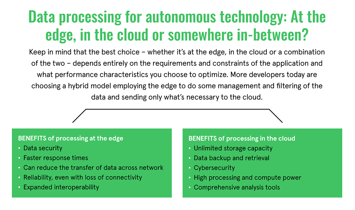 For autonomous applications, the cloud-versus-edge decision comes down to whether enough processing power is available at the edge and if split-second decision-making is needed. If the answer to both is “yes,” edge processing is mandatory and reliance on the cloud may be of less importance. If not, the cloud can be an excellent choice. And, of course, the needs of many applications fall somewhere in between.
